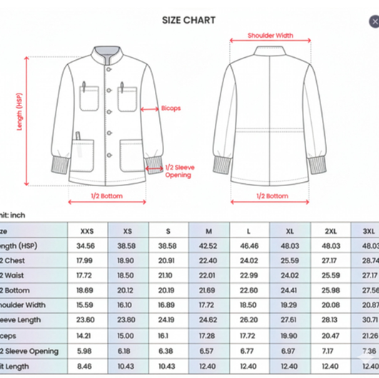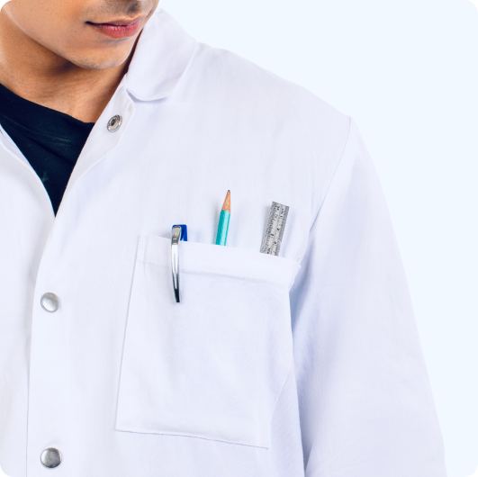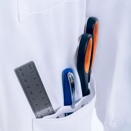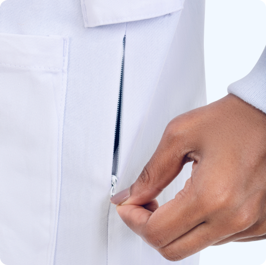 Lab Coat with smart features includes dedicated tool holders, ensuring your pipet or pens stay securely in place. Zippered pant pocket slits add quick inner pocket access without snagging, while high button placement offers extra coverage, and metal snap buttons make it easy to remove. Knitted wrist cuff keeps your lab coat away from your experiments. Stay organized and protected!